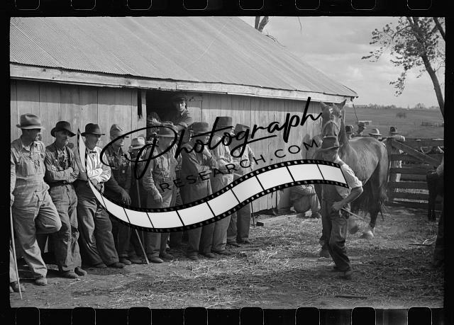 Auctioneers,buyers,farmer with horse,farm sale,Pettis County,Missouri,MO,FSA,1