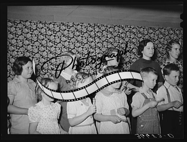 Title: The school day opens with prayer at private school at the Farm Bureau building. Pie Town, New Mexico