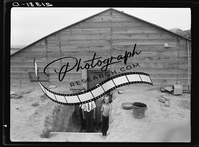 Title: The Wardlow family in their dugout basement home on Sunday. The youngest boy copies out a recipe for his mother. Dead Ox Flat, Malheur County, Oregon
