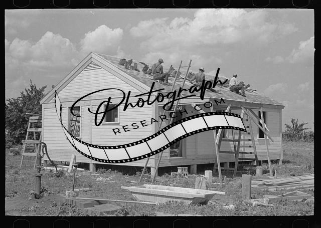 Title: Southeast Missouri Farms Project. House erection. Shingling crew at work on roof. Shingles are tucked in roof lath to keep them from blowing away