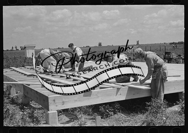 Title: Southeast Missouri Farms Project. House erection. Axeing crown of joist. Southeast Missouri Farms project field