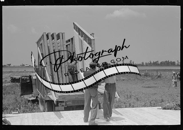 Title: House erection. Delivery of materials. Completed standard load of shop assembled panels. Southeast Missouri Farms Project