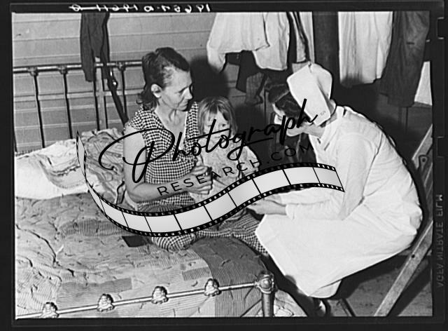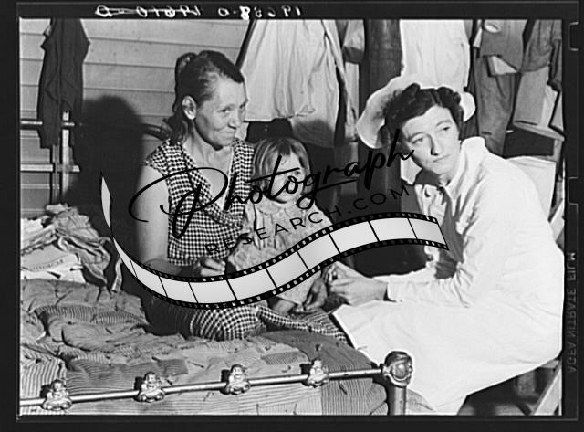 Title: Tulare County. Farm Security Administration camp (FSA) for migratory agricultural workers at Farmersville. Mother and child, come to California from Oklahoma. They have six children, aged two to nineteen years. The mother finished the eighth grade in school. They left their farming in Chicasha in the fall of 1936 to go to Arizona to pick cotton. They returned to Oklahoma to try again; failed and re-entered California February 27, 1938 to pick peas under a labor contractor. The father is chairman of camp council