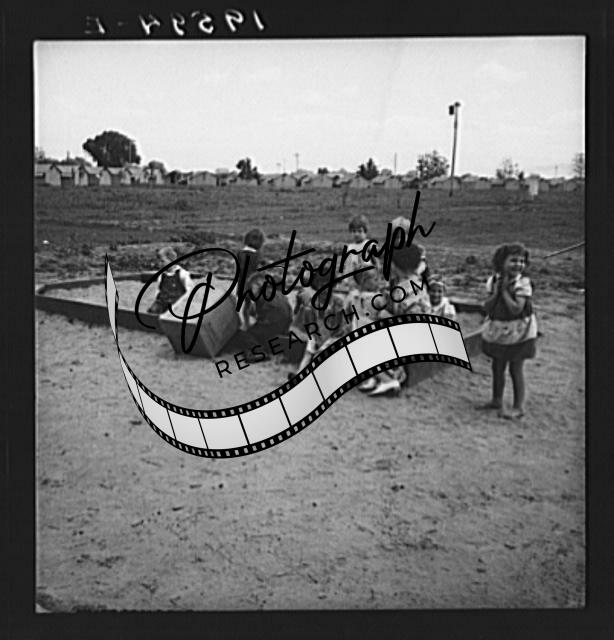 Title: Farm Security Administration (FSA) camp at Farmersville. Nursery school children showing community laundry building. California