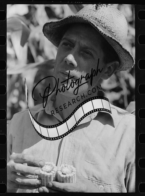 Farmer looks atsize of cob,judging quality of hybrid corn,Hardin County,Iowa,9