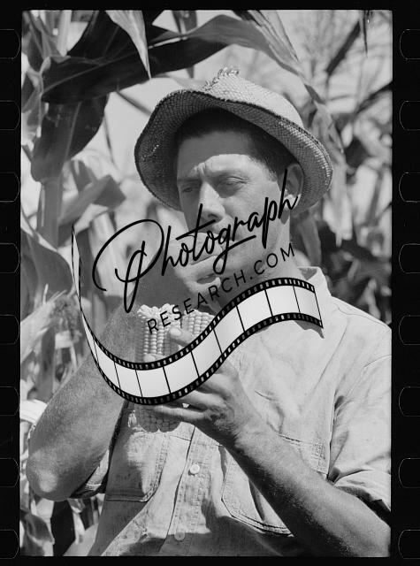 Farmer looks atsize of cob,judging quality of hybrid corn,Hardin County,Iowa,11