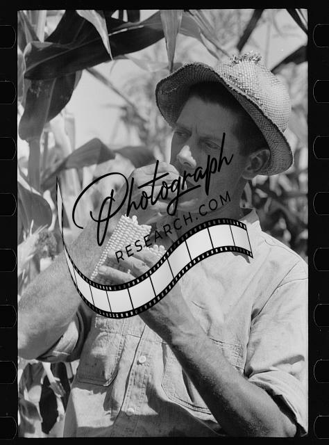 Farmer looks atsize of cob,judging quality of hybrid corn,Hardin County,Iowa,14