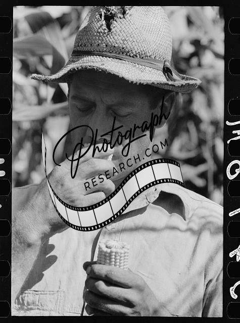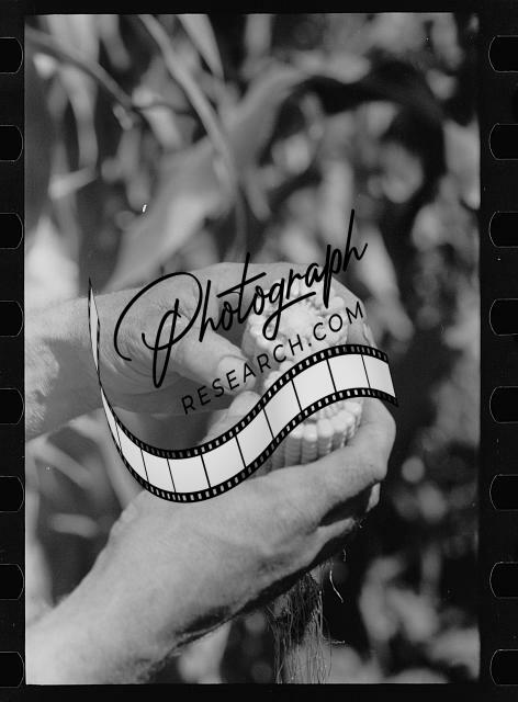 Farmer looks atsize of cob,judging quality of hybrid corn,Hardin County,Iowa,1