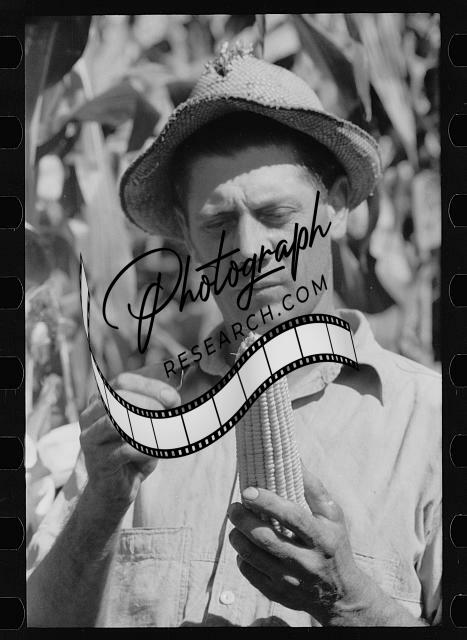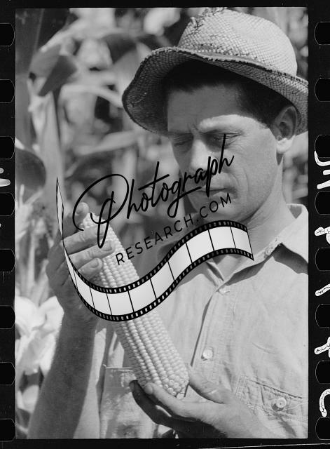 Farmer looks atsize of cob,judging quality of hybrid corn,Hardin County,Iowa,6