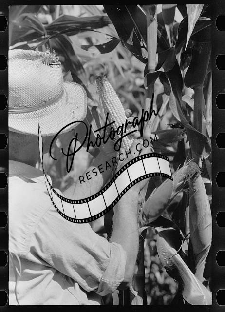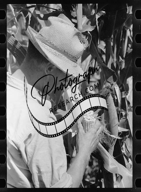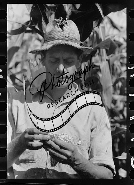 Farmer looks atsize of cob,judging quality of hybrid corn,Hardin County,Iowa,1