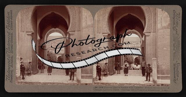 Famous Gate of Pardon with cathedral-mosque beyond Court of Oranges, Cordova, Sp
