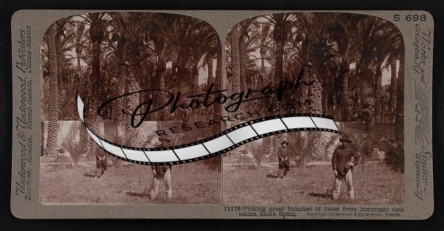 Picking great bunches of dares from luxuriant date palms, Elche, Spain