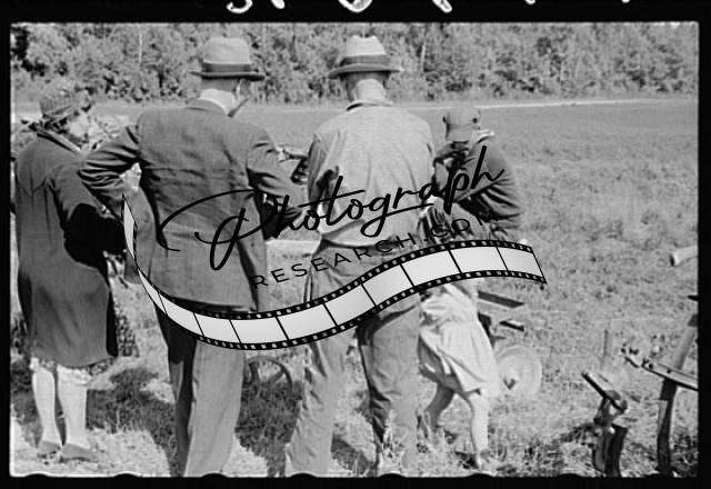Farmers looking over sled at auction near Tenstrike,Minnesota,MN,1939,FSA,3