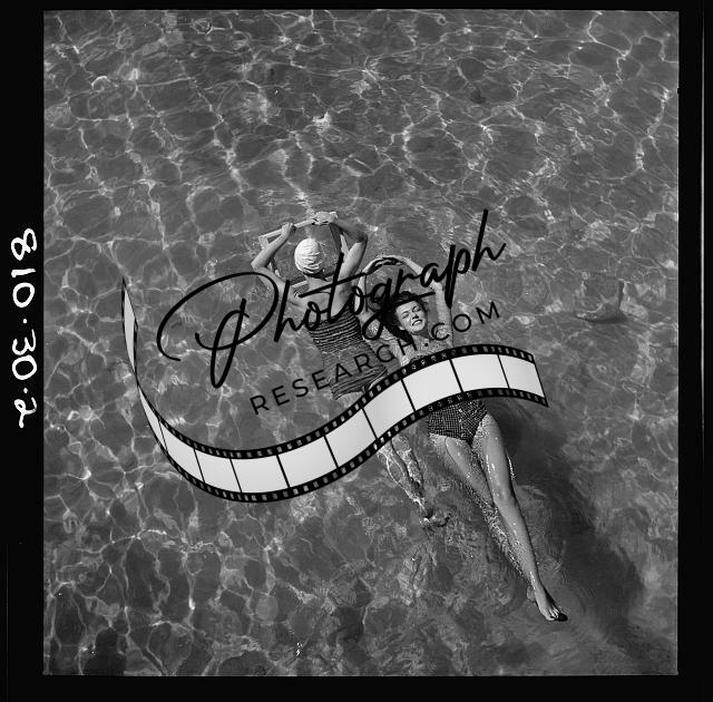 Fashion models posing,bathing suits,floating,swimming pool,T Frissell,1948