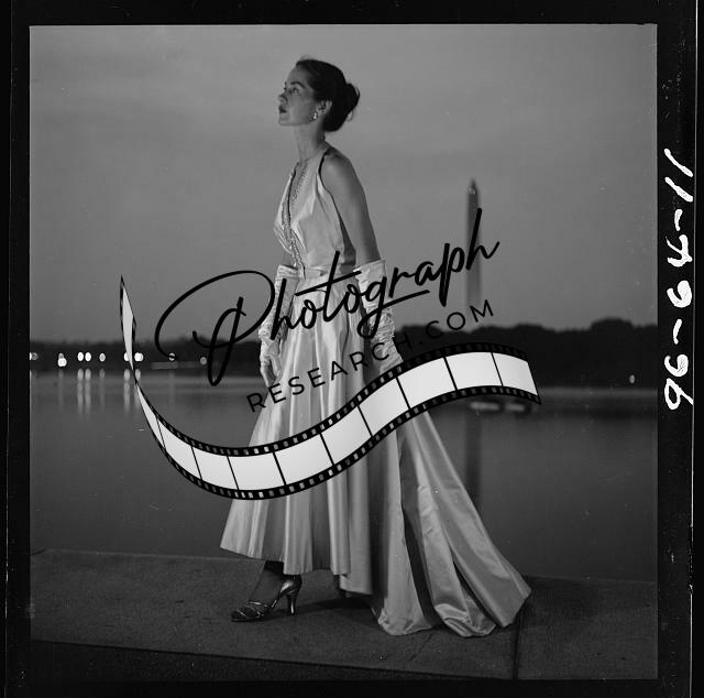 Fashion model posing,evening gown,dusk,Tidal Basin,Washington Monument,1949