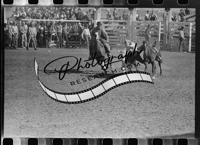 Title: 'Wild steer wrestling' at the rodeo of the San Angelo Fat Stock Show, San Angelo, Texas. Two cowboys ride the wild steer between them before one of them dismounts to bulldog the steer