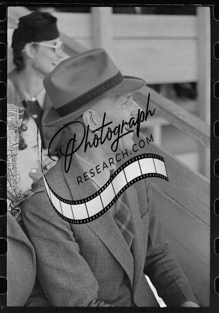 Title: Spectators at the rodeo looking at the program. San Angelo Fat Stock Show, San Angelo, Texas