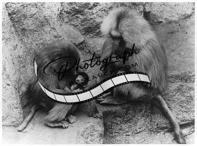 Baboon family group,mother is cradling baby;father is masturbating,London Zoo