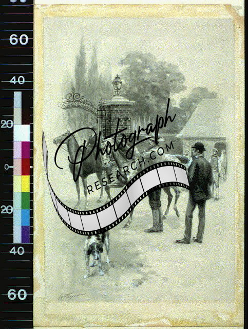 Man preparing to mount horse in courtyard while woman,servants watch,Relyea,1900