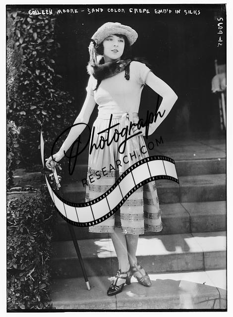 Colleen Moore,Model,sand color crepe embroidered,silks,fur stole,hats,dresses