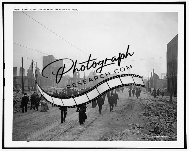 Looking up Market Street,earthquake,ruin,ferry,San Francisco,California,CA,c1906
