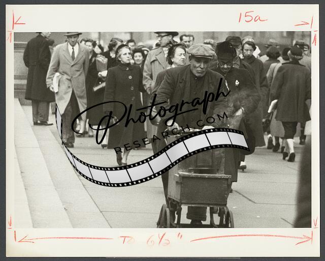 [[Man, full-length portrait, pushing cart on sidewalk, pedestrians nearby]]