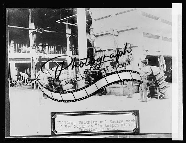 Filling,weighing,sewing sacks of raw sugar at Plantation mill,Hawaiian Islands