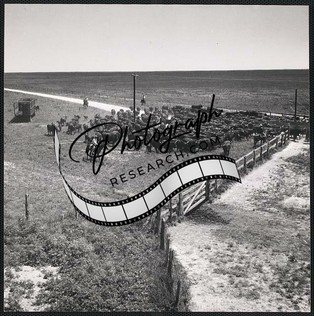 Three vaqueros herding cattle through a fence, King Ranch, Texas