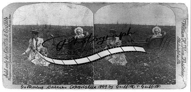 Gathering daisies,c1899,woman,field,children,stroller,baby carriage,photograph