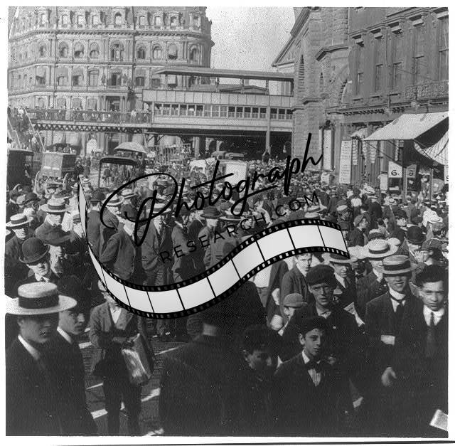 Crowd around New York end of Brooklyn Bridge,Rush Hour,c1904,Elevated Train