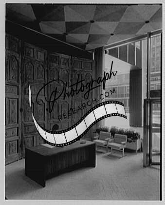 Title: First National City Bank, International Division, Park Ave. and 53rd St., New York. Clocks and alcove