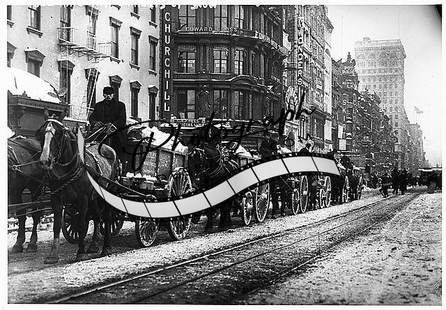 Wagons removing snow,line of horse-drawn wagons hauling snow,NYC,1908,New York