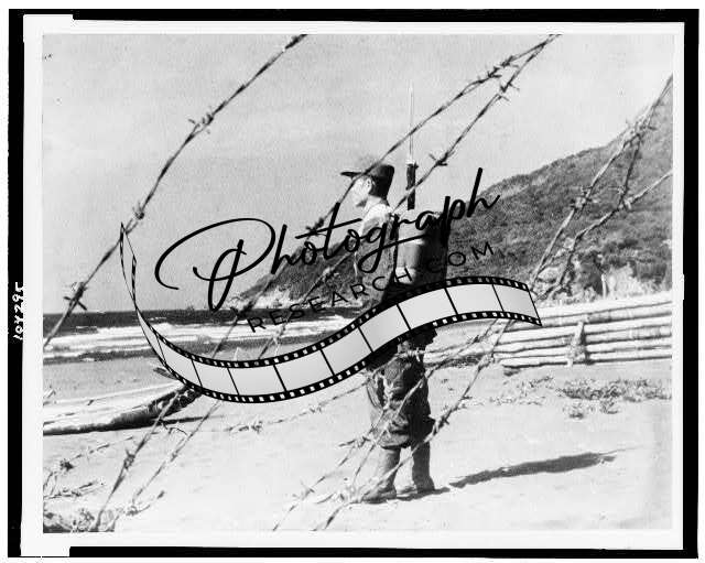 Guard,Formaosa,Chinese Nationalist soldier stands,sandy beach,Chinese Reds,1955