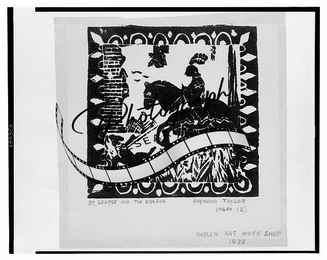 St. George and the dragon, Print showing Saint George mounted on a horse and slaying a dragon.