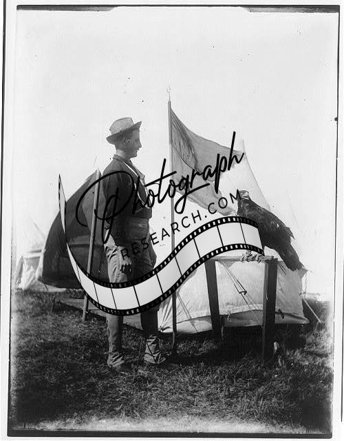Soldier,eagle mascot beside H Troop flag,tents,birds,Frances B Johnston,1898