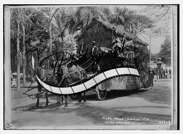 An old Hawaiian dwelling - float in Floral Parade,Honolulu,Hawaii,HI,1910,horses