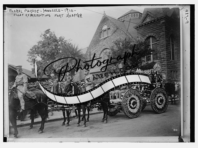 Float representing Fort Shafter,Floral Parade,Honolulu,Hawaii,HI,1910,horses