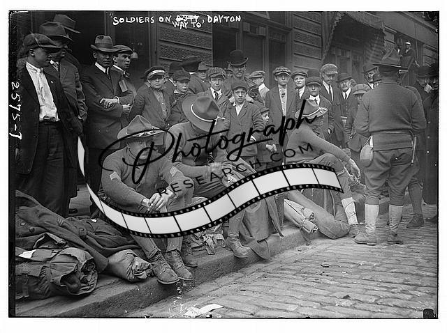 Soldiers on way to Dayton,1910-1915,in uniform,seated on curb,Bain News Service