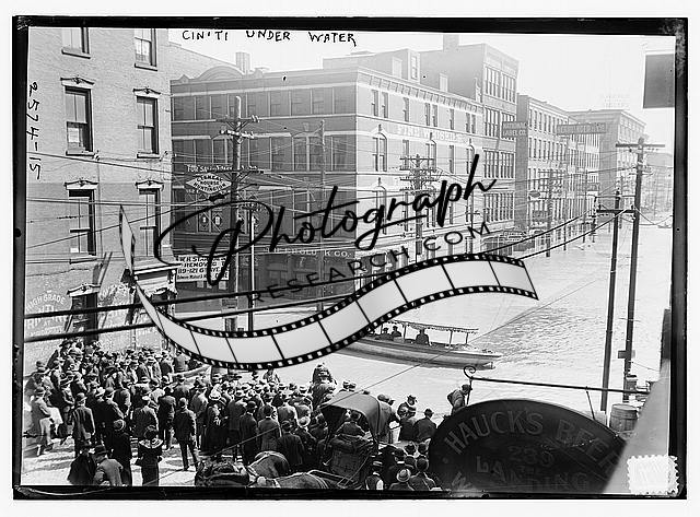 Cincinnati under water,Ohio,1910-1915,boat,Hauck's Beer sign,people,horse