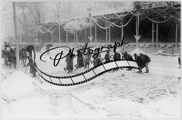 William Howard Taft,1857-1930;men clearing snow,reviewing stand,White House,1909