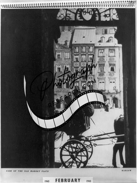 Old market place,doorway,man,wagon,horse drawn,buildings,Warsaw,Poland,1943