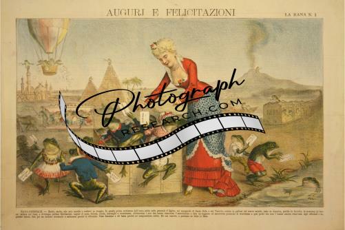 Auguri e felicitazioni,c1881,humorous,frogs dressed in street clothes,woman