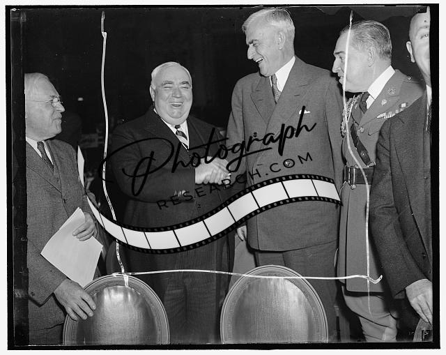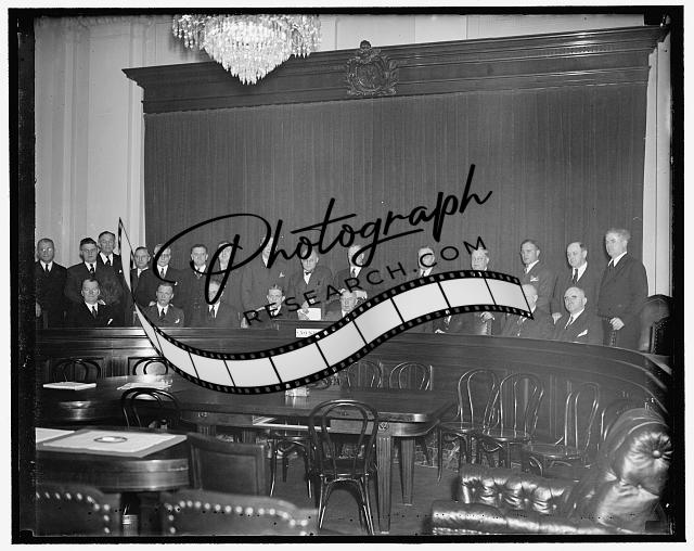 Title: Congratulations. Washington D.C., March 8. Following his fiery speech before the Convention of the Labor Non-Partisan League today, Senator Robert F. Lafollette, Progressive of Wisconsin, is congratulated by John L. Lewis, United Mine Worker President and Chairman of the Executive Committee of the League, and Sidney Hillman (center), Secretary Treasurer. In his speech Senator Lafollette urged the league to campaign aggressively on behalf of President Roosevelt's court reorganization plan. Six hundred labor leaders from all parts of the country are attending the convention, 3/8/1937