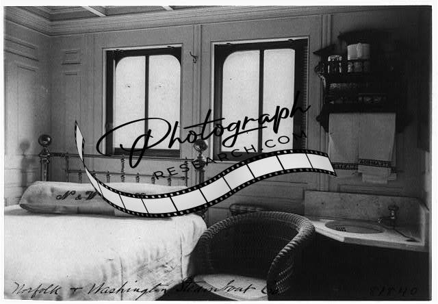Interior view,steamboat cabin,quarters,towels,sinks,chair,bed,passengers,c1900