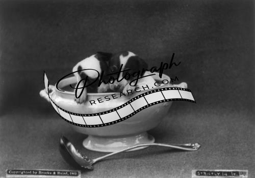 'Strictly in it',two puppies posed in soup tureen,October 31,c1903,animals
