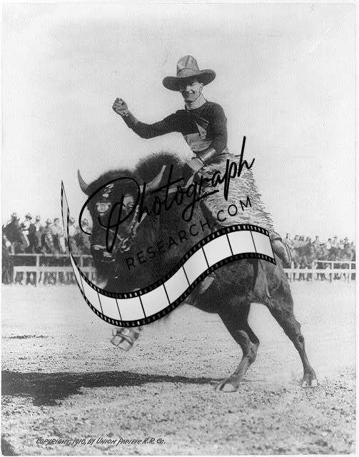 Vern Elliott on bucking buffalo at Cheyenne Frontier Days,Laramie County,WY,1910