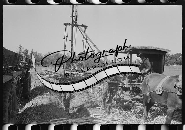 Sugarcane being unloaded onto trailer truck by a machine,New Iberia,Louisiana,1