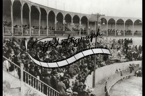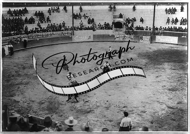 Bull fight,Mexico,matador and bull in arena,bull's head is to left,crowd