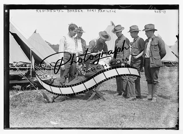 Fort Hamilton,barber shaving soldier with other soldiers waiting in line