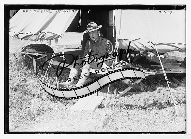 Fort Hamilton,soldier writing home,June 1908,smoking on a pipe
